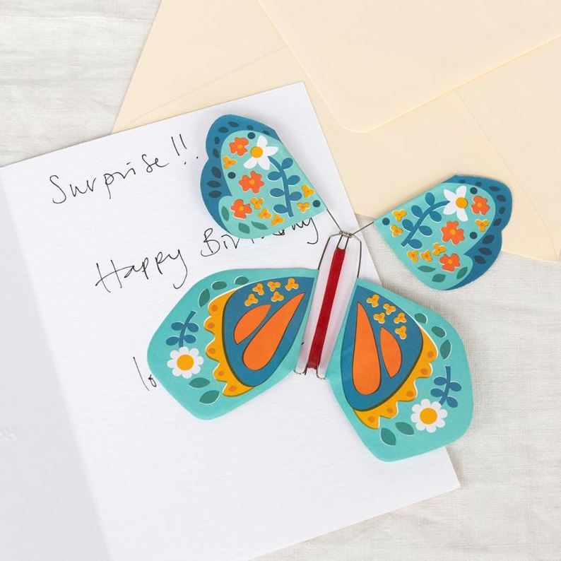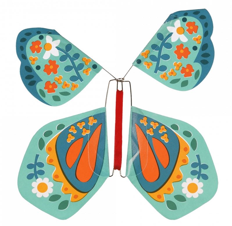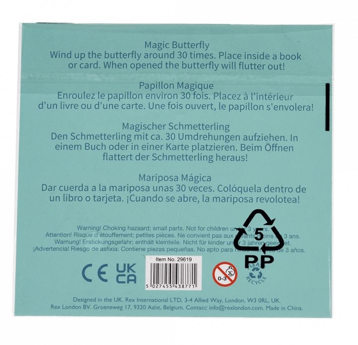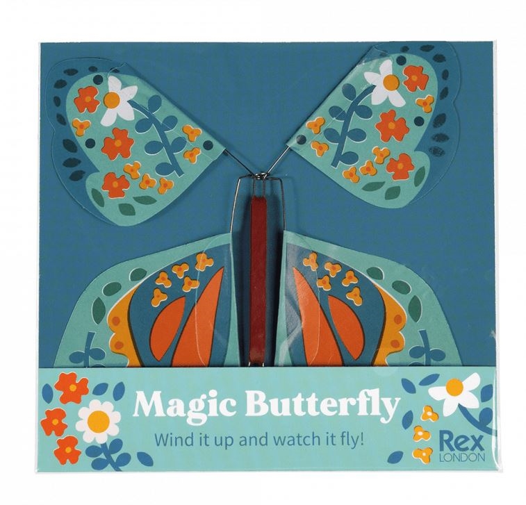 En skøn og overraskende lille gaveidé fra Rex London! Denne magiske sommerfugl trækkes op via et elastik, og når du lægger den ind i et kort eller en bog, vil den flyve ud, når modtageren åbner. En sjov, uventet og helt igennem magisk oplevelse, der får både børn og voksne til at smile.