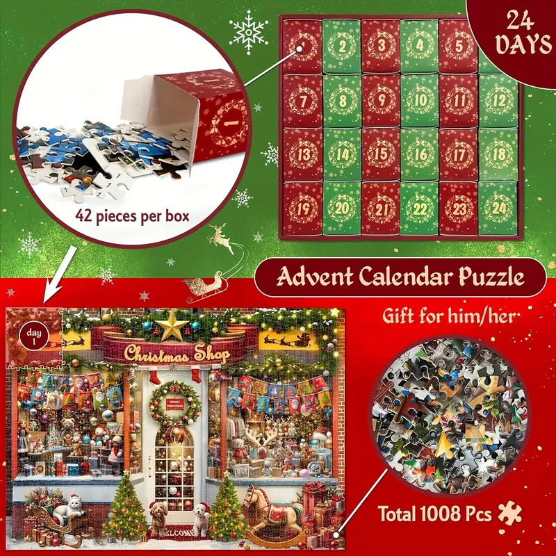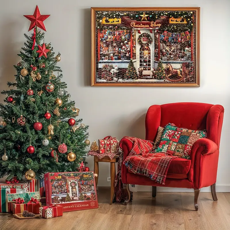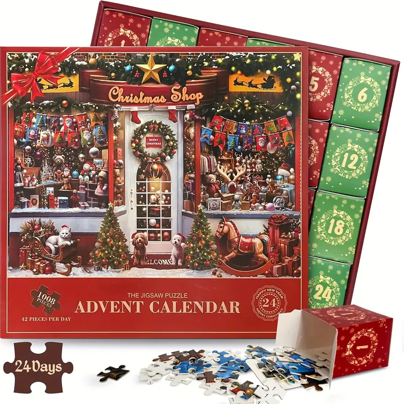 Kalenderpuslespil Christmas Shop. 24 æsker med ialt 1008 brikker