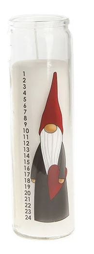 Kalenderlys i glas med nissemotiv i grå/røde farver fra Det Gamle Apotek. 100% paraffin, 60 timers brændetid og sikker nedtælling til jul. Kun 59 kr.