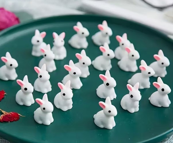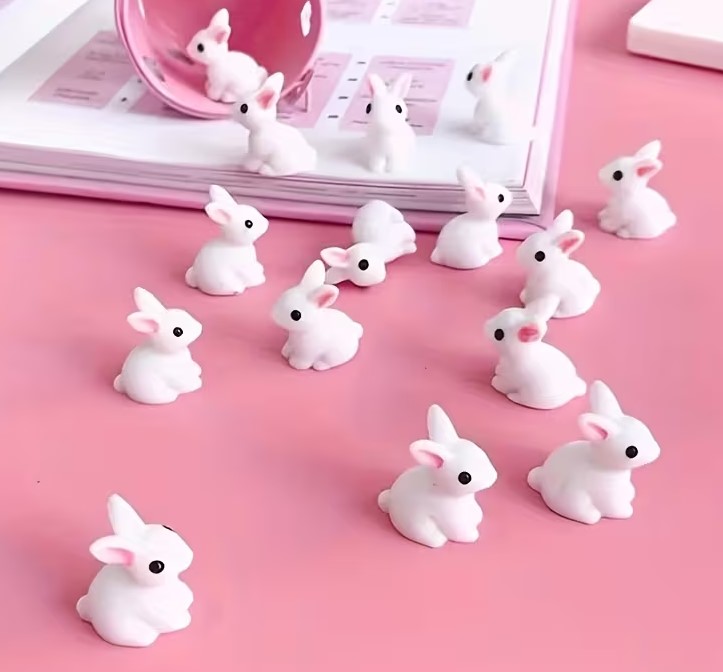Mini kanin i hvid resin – med sorte øjne og pink ører (1,4 × 2,2 cm)